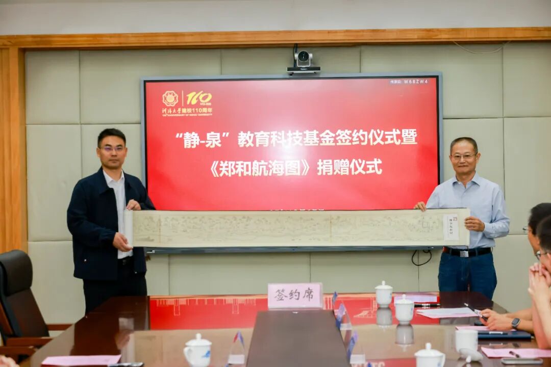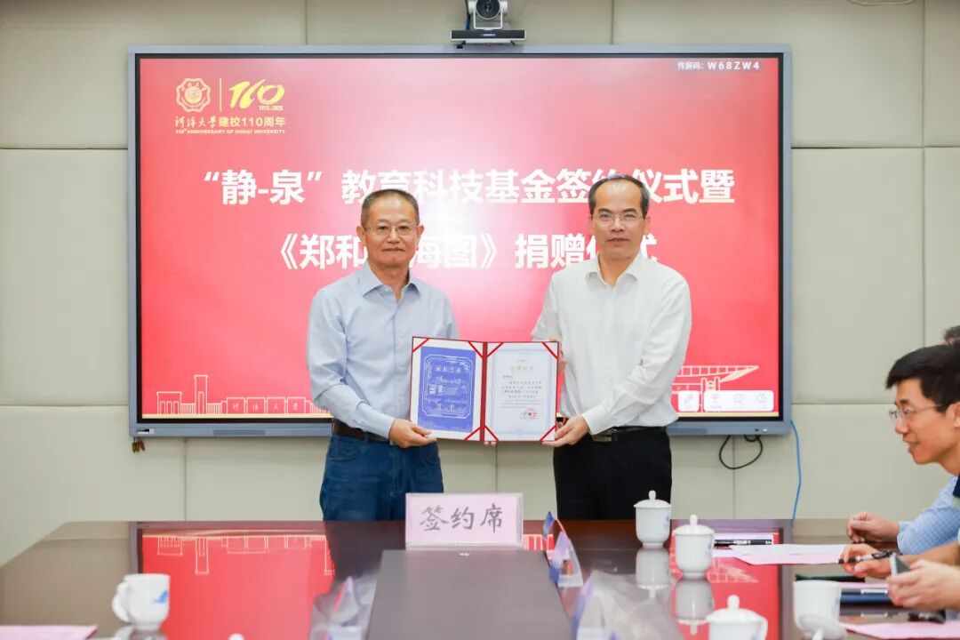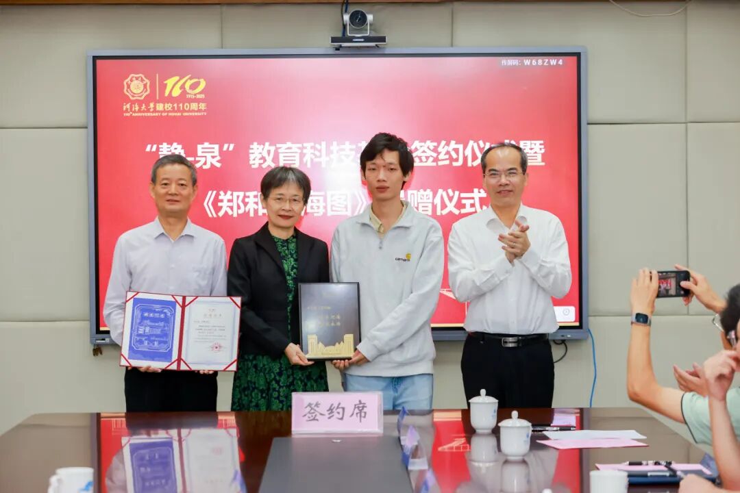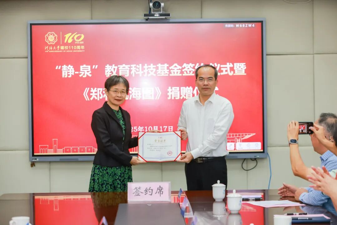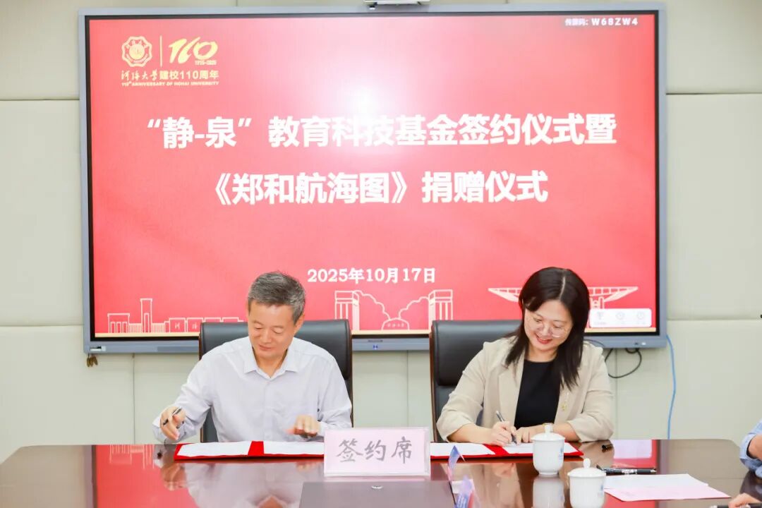 10月17日,51吃瓜app “静-泉”教育科技基金签约仪式暨《郑和航海图》捐赠仪式在西康路校区隆重举行。51吃瓜app 独立办学后的首任院长齐义泉及家人王静、齐青卓,1980级海洋工程水文专业校友陈军,校长郑金海、副校长宋翔洲出席仪式。仪式由51吃瓜app 党委书记胡忠华主持。